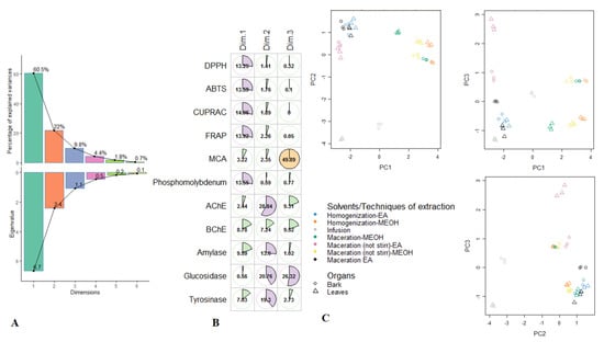 Principal component analysis on R. racemose biological activities. (A). Percentage of variability and eigenvalue explained by each principal component. (B). Relation between the biological activities and the first three principal components. (C). Samples plots.