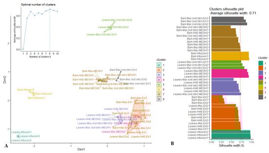 PCA allowed for the highlighting of a similarity in biological activities among several samples of R. racemosa. However, some samples could not be assigned to a certain well-defined group. For this purpose, the k-medoids clustering statistic was employed under the result of PCA for classification of samples into a small number of homogeneous clusters. From the cluster map reported in Figure 2A, it can be seen that the samples were partitioned in eight clusters. Indeed, besides the three clusters emphasized through PCA, five other clusters were identified. The quality of the clustering was assessed using the average silhouette approach. As observed (Figure 2B), the clustering was excellent with average silhouette width of 0.71 which had revealed close to 1.