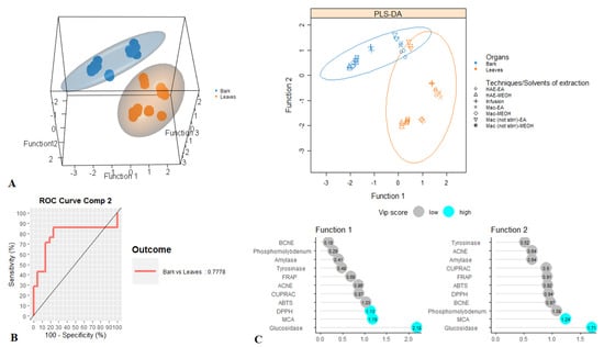 Discrimination between leaves and bark samples through PLS-DA. (A). Three- and two-dimensional score plots. (B). Area Under the Curve average using one-vs-all comparisons. (C). Biological activities assays explaining the largest part of the variance between the two organs.