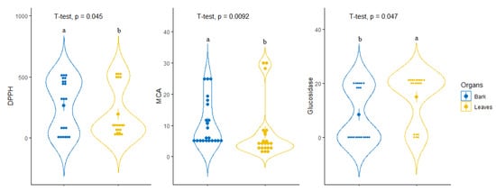For tentative diagnosing discrimination between the two organs, datasets derived from evaluated biological activities were submitted to PLS-discriminant analysis. Scatter plot of PLS-DA analysis, pointed to a separation of bark and leaves extracts, with satisfactory parameters, being 0.77 for AUC when taking into account the first two components (Figure 3A,B). Afterwards, the most significant assays that allowed us to separate the two organs were identified. Among all evaluated biological activities glucosidase, MCA and DPPH were found to be the most important assays for organ discrimination (Figure 3C). A comparative assessment into the consideration of these biological assays showed that the highest DPPH radical scavenging and Cu2+ chelating activity was observed in the stem bark samples while leaf samples exhibited important inhibitory against glucosidase compare to those of stem bark (Figure 4).