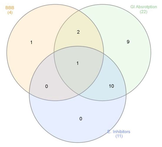 Venn diagram summarizing the criteria for selecting extracts’ phytochemicals, basing on pharmacokinetics (Gastrointestinal (GI) absorption and blood brain barrier (BBB) crossing) and biological properties (enzyme inhibition).