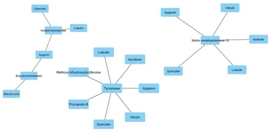 Components-targets analysis highlighting the putative interactions of luteolin, apigenin, vitexin, isovitexin, quercetin, procyanidin B and methoxy-trihydroxy(iso)flavone with tyrosinase, cholinesterases and metalloproteinase-12.