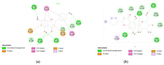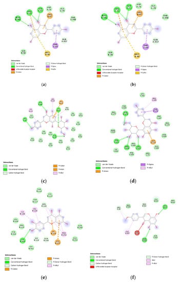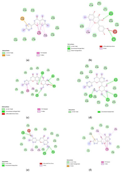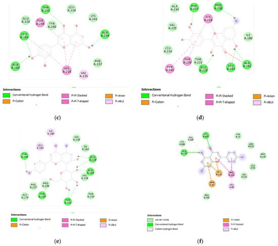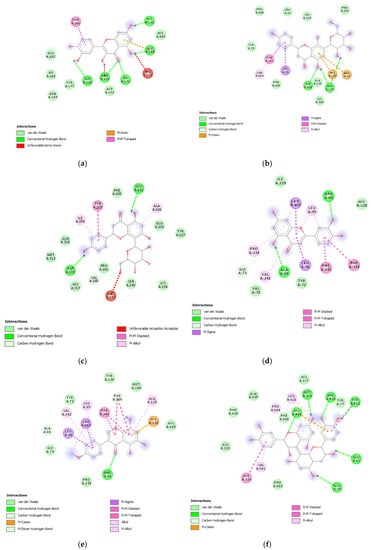 (a) Putative interactions between apigenin and MMP-12 (PDB: 3F17). Free energy of binding (ΔG) and affinity (Ki) are −8.3 kcal/mol and 0.8 µM, respectively. (b) Putative interactions between isovitexin and MMP-12 (PDB: 3F17). Free energy of binding (ΔG) and affinity (Ki) are −8.8 kcal/mol and 0.4 µM, respectively. (c) Putative interactions between luteolin and MMP-12 (PDB: 3F17). Free energy of binding (ΔG) and affinity (Ki) are −8.7 kcal/mol and 0.4 µM, respectively. (d) Putative interactions between quercetin and MMP-12 (PDB: 3F17). Free energy of binding (ΔG) and affinity (Ki) are −8.7 kcal/mol and 0.4 µM, respectively. (e) Putative interactions between vitexin and MMP-12 (PDB: 3F17). Free energy of binding (ΔG) and affinity (Ki) are −8.8 kcal/mol and 0.3 µM, respectively. (f) Putative interactions between apigenin and lanosterol-14-alpha demethylase (PDB: 4LXJ). Free energy of binding (ΔG) and affinity (Ki) are −8.8 kcal/mol and 0.4 µM, respectively.
