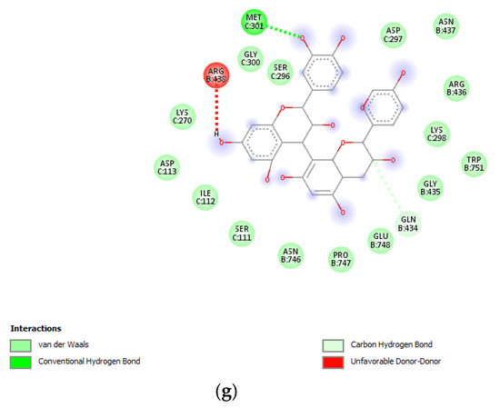 (a) Putative interactions between apigenin and E. coli gyrase (PDB: 6RKS). Free energy of binding (ΔG) and affinity (Ki) are −7.3 kcal/mol and 4.5 µM, respectively. (b) Putative interactions between quercetin and E. coli gyrase (PDB: 6RKS). Free energy of binding (ΔG) and affinity (Ki) are −7.2 kcal/mol and 5.4 µM, respectively. (c) Putative interactions between isovitexin and E. coli gyrase (PDB: 6RKS). Free energy of binding (ΔG) and affinity (Ki) are −8.4 kcal/mol and 0.7 µM, respectively. (d) Putative interactions between vitexin and E. coli gyrase (PDB: 6RKS). Free energy of binding (ΔG) and affinity (Ki) are −8.5 kcal/mol and 0.6 µM, respectively. (e) Putative interactions between luteolin and E. coli gyrase (PDB: 6RKS). Free energy of binding (ΔG) and affinity (Ki) are −7.7 kcal/mol and 2.3 µM, respectively. (f) Putative interactions between methoxy-trihydroxy(iso)flavone and E. coli gyrase (PDB: 6RKS). Free energy of binding (ΔG) and affinity (Ki) are −6.9 kcal/mol and 8.9 µM, respectively. (g) Putative interactions between procyanidin B and E. coli gyrase (PDB: 6RKS). Free energy of binding (ΔG) and affinity (Ki) are −8.0 kcal/mol and 1.4 µM, respectively.