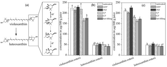 (a) Rearrangement of violaxanthin to luteoxanthin according to Schieber et al. [35]. Violaxanthin and luteoxanthin ester contents in the untreated and pasteurized juices without (b) and with (c) ultrasonication. Different letters indicate significant differences (p ≤ 0.05). Values are means ± standard deviation (n = 3).
