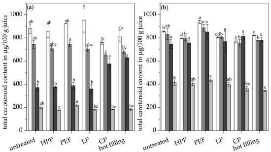 Contradictory observations concerning the effects of different pasteurization techniques on the carotenoid content in orange juice are stated in the literature, which can be attributed to different processing conditions, such as juice extraction, pasteurization conditions, and equipment. Several studies observed no significant differences compared to untreated orange juice in the case of low thermal pasteurization [7], high pressure processing [42,43,44], pulsed electric field technology [7,29,42,44], and traditional pasteurization [29]. Significantly higher carotenoid contents in orange juice treated with high pressure were shown by Plaza et al. [7] and Sánchez-Moreno et al. [10,29], whereas some studies described a reduced carotenoid content in thermally-treated orange juices [3,45,46]. Depending on the strength of the pulsed electric field treatment, increased and decreased carotenoid contents were both described [46]. In the present study, the conventionally pasteurized juice (759.95 µg/100 g juice) and the hot filled juice (815.30 µg/100 g juice) showed a significantly lower total carotenoid content compared to the low pasteurized juice (954.10 µg/100 g juice), as shown in Figure 1. High temperatures during processing, such as conventional pasteurization and hot filling might cause the instability of the polyene chain of the carotenoids, resulting in carotenoid degradation trough isomerization, oxidation, and cleavage. Overall, the differences are rather low and the observed losses might not be of high relevance for the final product regarding the consumer’s point of view.
