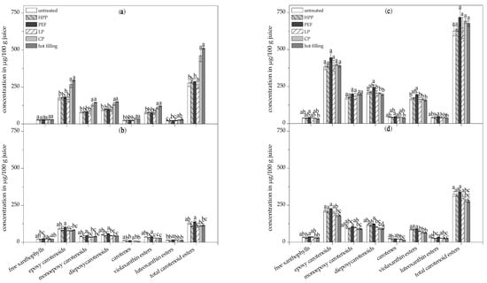 The lowest total carotenoid contents in the total fraction (insoluble and soluble carotenoids) were observed in the high thermally-treated juices (hot filling and conventional pasteurization), as shown in Figure 3a, due to preceding carotenoid degradation to non-colored cleavage products by the high temperatures. Nevertheless, the total fraction of the conventionally pasteurized and hot filled juice contained the significantly highest proportions of soluble carotenoids of 88.1 and 90.7%, respectively, compared to the other juices (<53.2%), as shown in Figure 3a. Similar effects were observed in the carotenoid profile for epoxy carotenoids, monoepoxy carotenoids, diepoxy carotenoids, carotenes, total carotenoid esters, and violaxanthin esters, showing significantly higher concentrations in the soluble fraction of the hot filled and conventionally pasteurized juice compared to the untreated juice and all other pasteurized juices, as shown in Figure 4a.