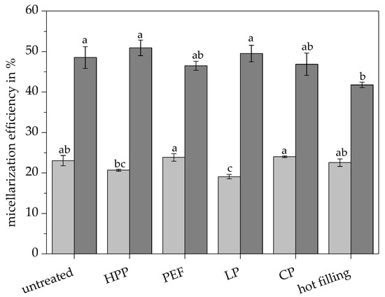 Despite similar initial total carotenoid contents in the juices, the total carotenoid content in the micelles was significantly increased to 343.44–436.33 µg/100 g in the ultrasonicated samples compared to 177.41–220.08 µg/100 g in the non-ultrasonicated samples, as shown in Figure 3. Thus, the micellarization efficiency of total carotenoids was significantly increased by 85.3–159.5% to 41.7–50.9% by ultrasonication in the differently pasteurized juices, respectively, as shown in Figure 5. The low- and non-thermally-treated juices, such as the untreated, high pressure-treated, and low pasteurized juice, benefited most from the additional ultrasound treatment because of a lower degree of decomposition by the previously applied pasteurization technique. However, there was no significant difference in the carotenoid micellarization efficiency of the pasteurized ultrasonicated juices compared to the untreated ultrasonicated juice, except for the hot filled ultrasonicated juice, which showed a significantly reduced micellarization efficiency due to advanced carotenoid degradation, as shown in Figure 5.