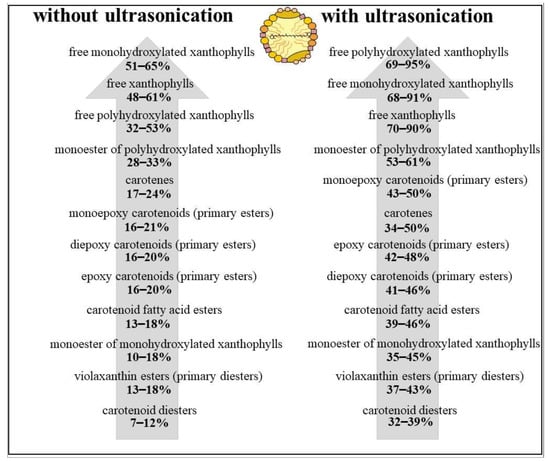 Micellarization efficiencies of several carotenoid groups in the orange juices without and with ultrasonication.