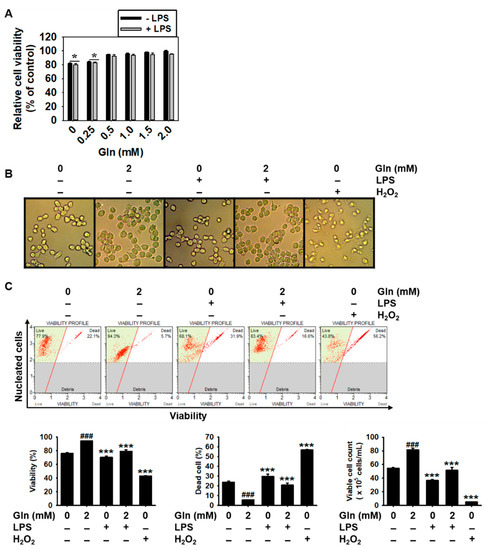 Viability (%), dead cell (%), and total viable cell counts were measured by flow cytometry. In brief, BV2 microglial cells were seeded overnight at a density of 1 × 105 cells/mL in 12 well plates, and were treated with 500 ng/mL LPS, in the presence or absence of 2 mM Gln, for 24 h. H2O2 (0.8 mM) was used as a cell death-inducing control. Then, the harvested cells were washed with ice-cold PBS and stained with Muse® Count & Viability Kit (MCH100102; EMD Millipore, Billerica, MA, USA) for 5 min. Viability (%), dead cell (%), and total viable cell counts were measured by the Muse® Cell Analyzer (EMD Millipore).