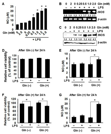 3.2. LPS-mediated iNOS Expression and NO Production Depend on the Presence of Gln