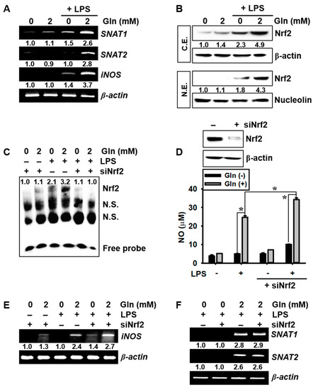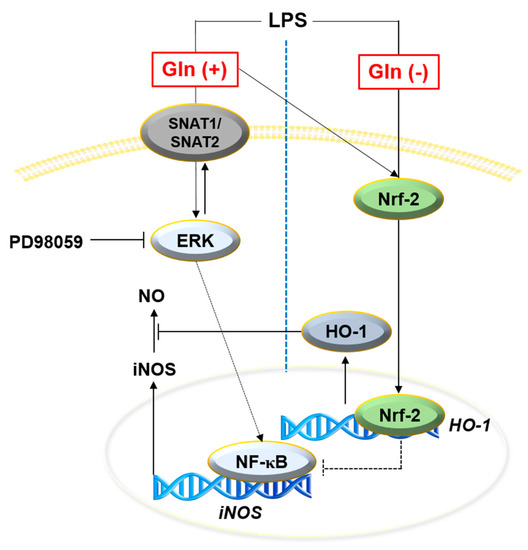 Glutamine (Gln) cooperatively regulates lipopolysaccharide (LPS)-mediated nitric oxide (NO) production. In the presence of Gln, LPS activates the expression of SNAT1 and SNAT2 through ERK phosphorylation, which increases Gln uptake and NO production. In addition, the Nrf2/HO-1 pathway decreases LPS-mediated NO production, but the pathway cannot inhibit LPS-mediated NO overproduction. On the contrary, in a Gln-free condition, SNAT1 and SNAT2 expression is low, and ERK phosphorylation is minimum, even in the presence of LPS; however, Nrf2 and HO-1 are still expressed, inhibiting LPS-mediated NO production. These data indicate that Gln is an essential molecule for LPS-mediated NO production.