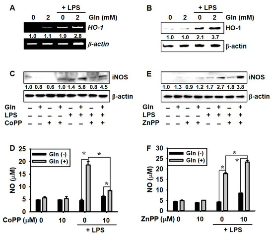 Glutamine (Gln) increases lipopolysaccharide (LPS)-mediated heme oxygenase-1 (HO-1) expression and nitric oxide (NO) production. BV2 microglial cells (1 × 105 cells/mL) were incubated in the presence or absence of Gln 2 h before being treated with 500 ng/mL LPS. (A) Total mRNA was isolated 6 h after LPS treatment, and RT–PCR for HO-1 was performed. (B) In a parallel experiment, protein lysates were prepared at 24 h, and equal amounts of the lysates were resolved on SDS-polyacrylamide gels, transferred to nitrocellulose membranes, and probed with a specific antibody against HO-1. (C,D) BV2 microglia cells were pretreated with 10 μM cobalt protoporphyrin (CoPP) for 1 h and then, incubated with LPS for 24 h, in the presence and absence of 2.0 mM Gln. (C) Western blotting was performed to check iNOS expression. (D) NO production was measured by Griess reaction. (E,F) BV2 microglia cells were pretreated with 10 μM zinc protoporphyrin (ZnPP) for 1 h, and then incubated with LPS for 24 h in the presence or absence of 2.0 mM Gln. (E) Western blotting was performed to check iNOS expression. (F) NO production was measured by the Griess reaction. β-Actin was used as the internal control for RT–PCR and western blotting. Densitometry values were expressed, as compared to the β-actin levels; these are displayed on each figure. The results are the average of three independent experiments and are expressed as the mean ± standard error of the median (* p < 0.01).