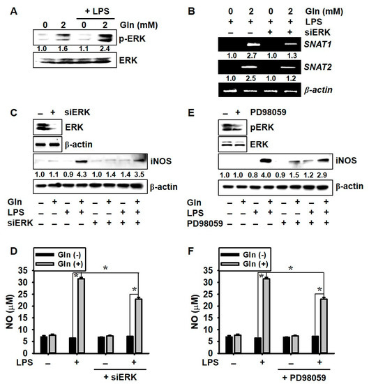 Glutamine (Gln) promotes extracellular signal-regulated kinase (ERK) phosphorylation and nitric oxide (NO) production as well as the expression of sodium-coupled amino acid transporter 1 (SNAT1) and SNAT2, under lipopolysaccharide (LPS) stimulation. BV2 microglial cells were incubated with 2.0 mM Gln, 2 h before treatment with 500 ng/mL LPS. (A) After 24-h incubation with LPS, protein lysates were resolved on the SDS-polyacrylamide gels, transferred to nitrocellulose membranes, and probed with specific antibodies against p-ERK and ERK. Total ERK was used as an internal control. Densitometry values were expressed, as compared to the total ERK levels; displayed at the bottom of the figure. (B) Total mRNA was isolated at 6 h and RT–PCR for SNAT1 and SNAT2 was performed. β-Actin was used as an internal control for RT–PCR. Densitometry values were expressed compared to the β-actin levels; displayed at the bottom of the figure. (C,D) The cells were transiently transfected with ERK-targeting siRNA (siERK) for 48 h. (C) Western blotting was performed to check ERK phosphorylation (top) and iNOS expression (bottom). (D) NO production was measured by the Griess reagent assay. (E,F) The cells were also preincubated with an ERK inhibitor, PD98059 (20 μM), for 2 h and were treated with LPS for 24 h. (E) Western blotting was performed to check ERK phosphorylation (top) and iNOS expression (bottom). (F) NO production was measured by Griess reaction. β-Actin was used as an internal control for iNOS protein expression. Densitometry values were expressed as compared to the β-actin levels; displayed at the bottom of the figure. The results are the average of three independent experiments and are expressed as the mean ± standard error of the median (* p < 0.01).