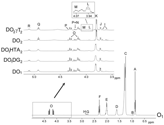 The identification of the components present in the original oils, in the oil samples enriched with phenolic compounds and in the lipid extracts of their digestates, was carried out on the basis of the assignments of the 1H NMR signals to the different kinds of hydrogen atoms, and in short to the different compounds. Figure 1 gives the spectral regions comprised between 0.0 and 4.9 ppm, of olive oil O1 1H NMR spectrum, and between 3.5 ppm and 5.10 ppm, conveniently enlarged, of the 1H NMR spectra of the lipids extracted from the several digestates (DO1, DO1DG2, DO1HTA2, DO2, and DO2γT2), in which signals of protons of their main components appear.