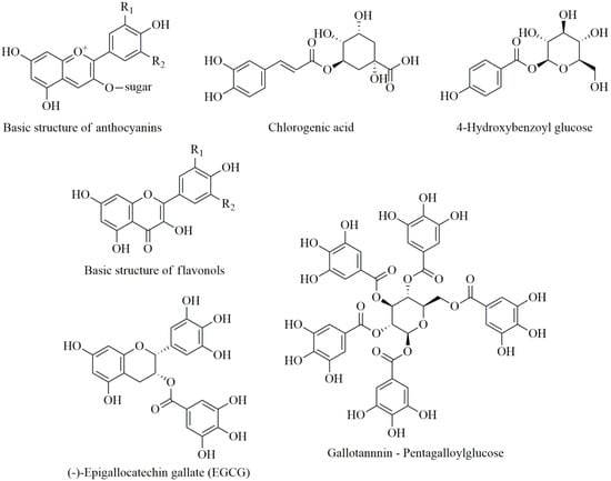 There are certain fruits very rich in polyphenols, which are characterized by the intensity of their aroma, taste, and color []. For example, grapes, apples, blueberries, strawberries, blackberries, raspberries, aronia, and plums are the richest in polyphenols []. The most commonly occurring polyphenols in fruit are anthocyanins (in colored fruit), then hydroxycinnamic and hydroxybenzoic acids along with their derivatives, followed by catechins, tannins, and flavonols [] (Figure 1).