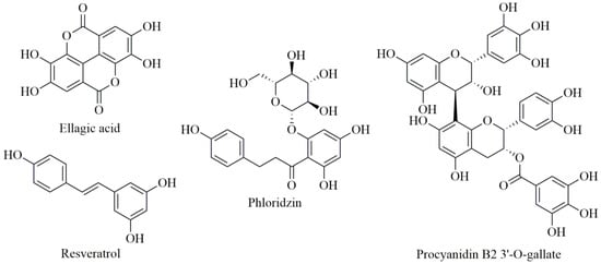 Ellagic acid and its derivatives (elagitannins) are known to be present in various berries, especially in berry seeds [,]. Chalcones are polyphenolic compounds that are specific to apple fruits, while resveratrol and some of its stilbene derivatives are characteristic of grapes (especially found in red grape skins) [], while the major polyphenols in grape seeds are proanthocyanidins [] (Figure 2).