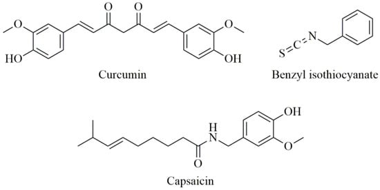 Chemical structures of curcumin, benzyl isothiocyanate, and capsaicin.
