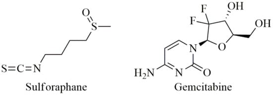 Early cancer metastases and aggressive growth can be caused by impaired regulation of stem cell self-renewal. Sulforaphane (SFN, Figure 4), mainly found in cruciferous vegetables, inhibits the self-renewal ability of PC stem cells (CSCs) and synergizes with quercetin, which is a predominant flavonoid in many fruits and vegetables especially in cruciferous vegetables []. The combination of quercetin and SFN had synergistic effects on the pancreatic CSCs’ self-renewal ability and that SFN alone or in combination with quercetin could eliminate the characteristics of cancer stem cells []. Furthermore, resveratrol and quercetin have been shown to inhibit PC cell line growth and are capable of reducing tumor cell invasion through the endothelial barrier, so they may be useful in the treatment of PC and the prevention of metastases [].