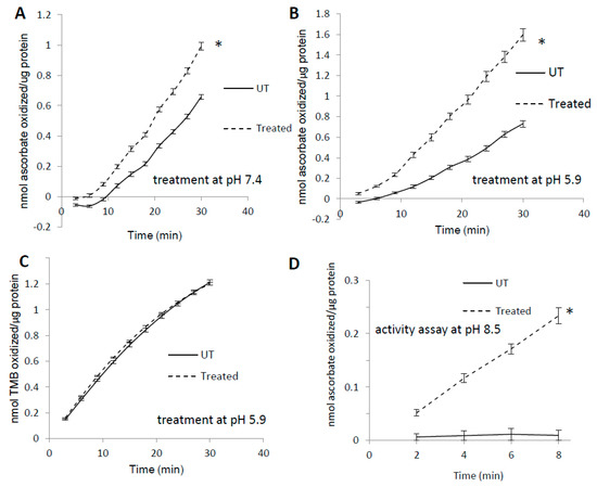 Pre-treatment with H2O2 increases MetMb peroxidase activity in a substrate-dependent manner. MetMb (111 μM, pH 5.9) was untreated (UT) or was pre-reacted with 50 μM H2O2 for 15 min at (A) pH 7.4 (n = 12/group, * p < 0.05) and (B) pH 5.9 (n = 7/group, * p < 0.05) before 2 μL of this solution was added to a 200 μL reaction mixture on a 96-well plate containing 250 μM ascorbic acid and 200 μM H2O2. (C) metMb was reacted with H2O2 at pH 5.9 as described for (B), and peroxidase activity was measured using 500 μM TMB and 200 μM H2O2 (n = 10/group). (D) MetMb (222 μM) was pre-reacted with 100 μM H2O2 for 30 min before 1 μL of this solution was added to a 200 μL reaction mixture containing 250 μM ascorbic acid and 200 μM H2O2 at pH 8.5. * p ≤ 0.05, n = 12/group.