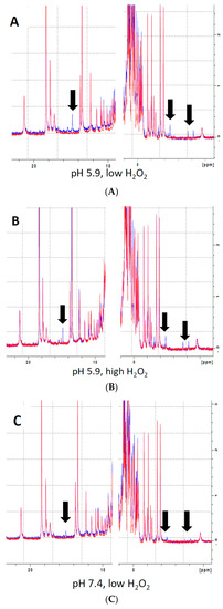 Analysis of the effects of H2O2 on heme electronic structure in Mb via 1H NMR spectroscopy revealed the presence of multiple novel peaks in the heme region (Figure 2, black arrows), indicating the presence of covalent modifications to the heme itself or to residues in its immediate vicinity. The presence of several novel peaks in the heme region might indicate either the presence of individual Mb-X molecules with multiple modifications, or, alternatively, that reaction of metMb with H2O2 results in various distinct Mb-X species. Since pre-treatment at lower pH further enhanced the ascorbate peroxidase activity of Mb (Figure 1B,C), we hypothesized that increased concentration of Mb-X species might be responsible for these effects. Consistent with our hypothesis, reaction of metMb with H2O2 at pH 5.9 produced ed the same novel heme resonances as found in metMb that was reacted with H2O2 at pH 7.4, though the intensity of these novel peaks was substantially increased at pH 5.9 (Figure 2A–C). We then sought to determine whether reaction at a higher H2O2 concentration would result in increased Mb-X formation. To our surprise, the higher H2O2 concentration had no effect on the amount of Mb-X present, as indicated by identical 1D 1H NMR spectra for low and high H2O2 concentrations (Figure 2A,B).