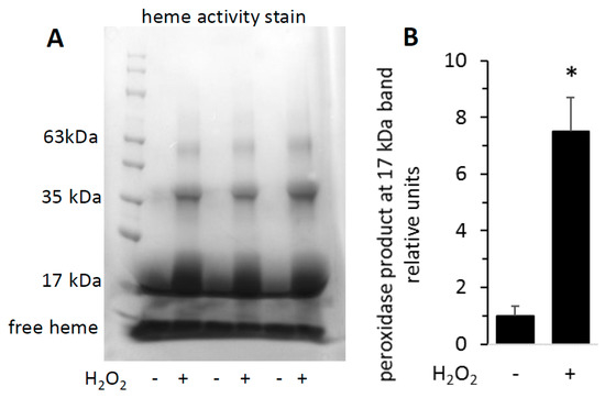 Reaction of metMb with H2O2 increases peroxidase activity as visualized on polyacrylamide gels. metMb (555 μM, pH 5.9) was incubated in the absence or presence of 800 μM H2O2 for 15 min before performing SDS-PAGE and (A) heme-peroxidase activity stains (right) as described in methods. (B) Quantitation of the peroxidase product at the 17 kDa band, n = 3/group, * p < 0.01.