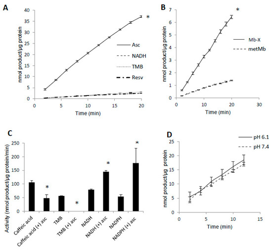 Mb-X species possess unique peroxidase activities compared to metMb. (A) Mb-X peroxidase activity was measured using ascorbic acid (Asc, 250 μM), resveratrol (Resv, 125 μM), NADH (250 μM) and TMB (500 μM) and 200 μM H2O2 at pH 6.1. The activity plots for all substrates except ascorbic acid overlap, so they are not all visible. n = 6/group, * p <0.05 vs. all other groups. (B) Mb-X concentration was estimated as described in the methods section. Peroxidase activity with ascorbic acid was then measured with 250 μM ascorbic acid and 200 μM H2O2 at pH 6.1. * p ≤ 0.05 compared to metMb, n = 3/group. (C) Mb-X peroxidase activity using caffeic acid (125 μM), TMB (500 μM) and NAD(P)H (250 μM) and 200 μM H2O2, pH 6.1 both in the presence and absence of 50 μM ascorbic acid. * p ≤ 0.05 compared to control without ascorbic acid, n = 3/group. (D) Mb-X peroxidase activity was measured at pH 7.4 and 6.1 using 250 μM ascorbic acid and 200 μM H2O2 (n = 3/group).