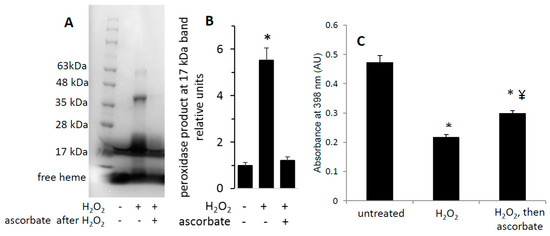 Heme-dependent reaction of H2O2-oxidized metMb with ascorbic acid is sufficient to reverse heme-protein crosslinks. (A) MetMb (111 μM, pH 6.1) was incubated in the absence or presence of 300 μM H2O2 for 10 min prior to adding 833 μM ascorbic acid for an additional 10 min and performing SDS-PAGE followed by (A) a heme peroxidase stain. (B) Quantitation of the peroxidase product at the 17 kDa band, n = 5/group, * p < 0.001. (C) Acid-butanone heme extraction was performed on metMb that was either untreated, reacted with H2O2 alone for 10 min (H2O2) or treated with ascorbic acid after 10 min of H2O2 oxidation. Free heme was assessed by absorbance at 398 nm. * p ≤ 0.05 compared to untreated control; ¥ p ≤ 0.05 compared to H2O2-only; n = 3/group.