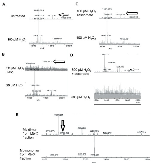 Matrix assisted laser desorption mass spectrometry-time of flight (MALDI-TOF) mass spectrometric analysis of ascorbic acid-mediated reversal of heme-protein crosslinks in H2O2-reacted metMb. (A) (Bottom spectra) MetMb tryptic digests that were reacted with 100 μM H2O2 displayed loss of the N-terminal peptide (1815.9 m/z) indicated by arrows in the untreated MetMb (top spectra). (B–D) Tryptic digests of H2O2-reacted metMb that was then treated with ascorbic acid revealed the re-appearance of the N-terminal peptide. (E). MetMb monomer (bottom) and dimer (top) tryptic digests that were reacted with 300 µM H2O2 and analyzed with MALDI-TOF MS. The arrow indicates a peak at 1993 m/z, which suggests presence of a heme crosslinked to a peptide containing the distal histidine of Mb helix E.