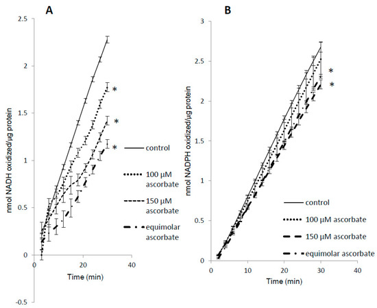 Substrate competition for metMb peroxidase activity. MetMb peroxidase activity with NADH (A) or NADPH (B) was measured in the presence of varying concentrations of ascorbic acid. * p ≤ 0.05 compared to NAD(P)H without ascorbic acid present. n = 6/group in (A) and n = 11–12/group in (B).