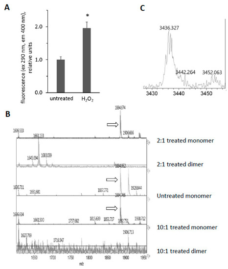 To detect dityrosine fluorescence using the fluorescence spectra described by Malencik et al. [17], fluorescence was measured at excitation and emission wavelengths of 290 nm and 400 nm, respectively, with a Synergy H1 platereader (Biotek, Winooski, VT, USA).