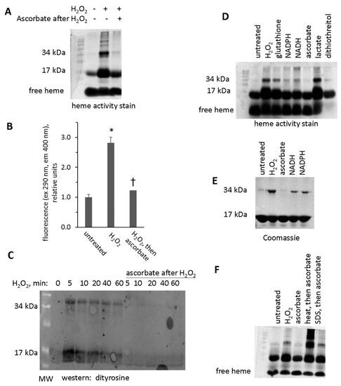 Treatment with ascorbic acid reverses crosslinking of Mb dimers. (A) Heme peroxidase activity stain of metMb that was untreated, H2O2-treated, or H2O2-treated followed by exposure to ascorbic acid. (B) Fluorescence of metMb treated as for panel A was assessed at excitation 290 nm and emission 400 nm, which correspond to the fluorescence characteristics of dityrosine [17], n = 8/group, * p < 0.001 vs untreated and group treated with peroxide and then ascorbic acid, † p = 0.05 vs untreated. (C) Western blot of ascorbic acid-treated oxidized metMb using an anti-dityrosine antibody. (D) Heme stain of H2O2-reacted metMb that was then treated with various reducing substrates. (E) Coomassie stain of Mb exposed to H2O2 and then reducing agents. (F) Heme stain of oxidized metMb that was denatured by heating for 10 min at 90 °C or by adding SDS-PAGE sample loading buffer prior to the addition of ascorbic acid.