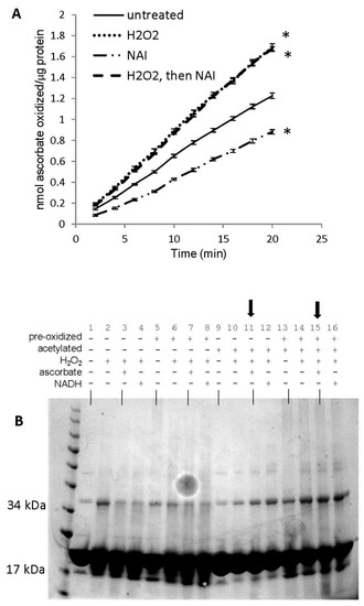 Role of tyrosine residues in regulating oxidatively-modified metMb species. (A) Peroxidase activity assay of metMb that had been treated with H2O2 alone, N-acetylimidazole (NAI) alone or H2O2 and then NAI (as described in methods and materials) using 200 μM H2O2 and 250 μM ascorbic acid at pH 6.1. * p ≤ 0.05 compared to untreated control, n = 6/group. Activity plots for H2O2 and NAI groups overlap, so they are not both visible. (B) Coomassie stains of the samples prepared in (A). Lanes 1–4: untreated, control metMb; H2O2-treated, control metMb; H2O2-treated control metMb + ascorbic acid; H2O2-treated control metMb + NADH. Lanes 5–8: same as (1–4) only using met Mb that had been reacted with H2O2 (pre-oxidized). Lanes 9–12: same as (1–4) and (5–8) only using NAI-treated metMb. Lanes 13–16: same only using H2O2-treated then NAI-treated metMb. Lanes showing that tyrosine-acetylated Mb cannot reverse Mb dimerization in the presence of ascorbic acid are indicated by arrows.