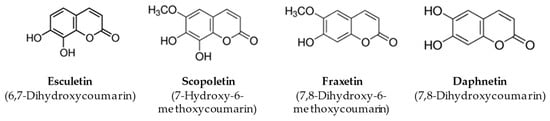 In this regard, several studies report that the orto-dihydroxyl (catechol) group and the α-pyrone ring present in coumarins ESC, FRAX and DAPH contribute to their radical scavenger and antioxidant activity [31,32]. Other studies also suggest that the number of hydroxyl groups on the ring structure of coumarins is strictly correlated with their antioxidant effects [33]. In agreement with this evidence, SCOP recorded the lowest scavenger activity compared to that of the other studied coumarins.