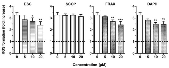 ESC, FRAX and DAPH, but not SCOP, counteract t-BuOOH—induced reactive oxygen species (ROS) formation in SH-SY5Y cells. Cells were treated for 2 h with various concentrations of the studied coumarins (5–20 µM) and then with t-BuOOH (200 µM) for 30 min. At the end of treatment, ROS formation was determined using the fluorescent probe 2′,7′-dichlorodihydrofluorescein diacetate (DCFH-DA). Data are expressed as fold increases of ROS formation induced by t-BuOOH and reported as mean ± SD of four independent experiments (* p < 0.05, ** p < 0.01 and *** p < 0.001 vs. cells treated with t-BuOOH at one-way ANOVA with Dunnett post-hoc test).