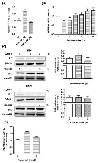 The SH-SY5Y cells were incubated for 24 h with ESC and DAPH [20 µM], and the intracellular GSH levels were then determined using the fluorescent probe MCB. The treatment with ESC, but not DAPH, was shown to significantly increase the GSH levels in SH-SY5Y cells (Figure 4A). In addition, the treatment with ESC (20 µM) at increasing times from 1 to 24 h registered significant decreases in GSH levels after short treatment times (1 and 2 h) and significant increases in GSH levels after long treatment times (12 and 24 h) (Figure 4B).