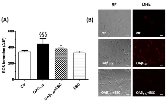 ESC prevents the ROS formation induced by OAβ1–42 in SH-SY5Y cells. (A) Cells were treated with ESC (20 µM) for 24 h and then with OAβ1–42 (10 µM) for 3 h. At the end of treatment, the ROS formation was determined using the fluorescent probe DHE. (B) Representative bright field (BF) and DHE fluorescence images. Data are expressed as AUF and reported as mean ± SD of three independent experiments (§§§ p < 0.001 vs. untreated cells, * p < 0.05 vs. cells treated with OAβ1–42 at one-way ANOVA with Bonferroni post-hoc test). Scale bars: 100 µM.