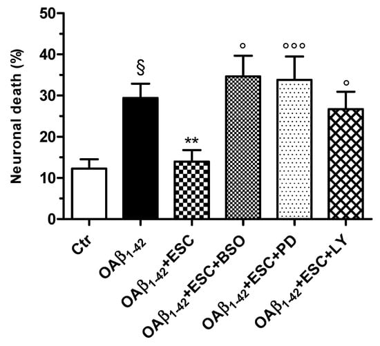 Neuroprotective effects of ESC are abrogated by the specific inhibitors BSO, PD98059 and LY294002 in SH-SY5Y cells. Cells were treated with ESC (20 µM) and the specific inhibitors BSO (400 µM), PD98059 (5 µM) and LY294002 (10 µM) for 24 h. Subsequently, cells were treated with OAβ1–42 (10 µM) for 24 h. At the end of treatment, the neuronal death was determined using the fluorescent probe PI. Data are expressed as percentage of dead cells and reported as mean ± SD of four independent experiments (§ p < 0.05 vs. untreated cells; ** p < 0.01 vs. cells treated with OAβ1–42; ° p < 0.05 and °°° p < 0.001 vs. cells treated with OAβ1–42 + ESC at one-way ANOVA with Bonferroni post-hoc test).