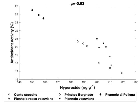 The analysis of correlation between the antioxidant activity and the most abundant metabolites, hyperoside, chlorogenic and gallic acids, identified and quantified through UPLC, revealed interesting aspects. Regarding hyperoside, the interrelationship between the concentration of this compound in each sample and the antioxidant activity indicated ρ = −0.93 (p = 6 × 10−7, Figure 1).