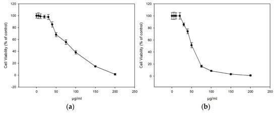 Figure 1. In vitro cytotoxicity assessment of honey extracts in human immortalized epidermal keratinocytes (HaCaT) cells. HaCaT cells were incubated with increasing concentrations of ME16.1 (a) and ME20.3 (b) honey extracts (0–200 μg/mL) for 24 h. Cell viability was determined by the SRB assay as described in Materials and Methods. The results are shown as ± SD of three independent experiments.