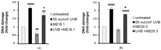 Figure 2. Honey extracts protect HaCaT cells from UVB-induced DNA damage. Cells were pre-incubated with 20 μg/mL of ME16.1 (a) or ME20.3 (b) for 2 h and then were either UVB-irradiated (55 mJ/cm2; treated) or left untreated (control). Treated and control cells were further incubated for 2 h in the presence or absence of honey extracts, left to recover for 24 h and then subjected to single cell gel electrophoresis (comet) assay. Data represent the fold-change of DNA damage in untreated (white), UVB-irradiated (black), honey-treated (light grey) and UVB-irradiated/honey-treated cells (dark grey). Data presented are the mean ± SD of three independent experiments performed in duplicates. ## p ≤ 0.01, #### p ≤ 0.001, significant differences compared to untreated cells * p ≤ 0.05, significant differences between UVB-irradiated and honey-treated/UVB-irradiated cells.