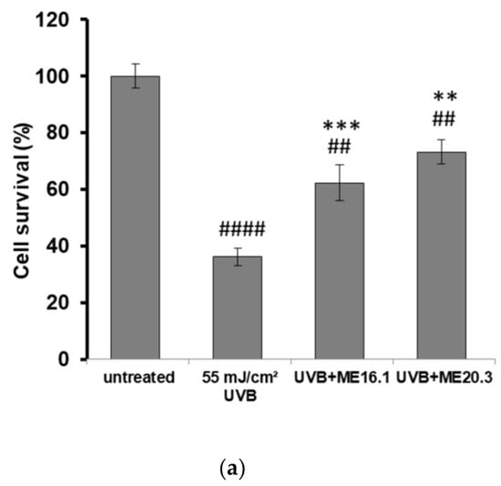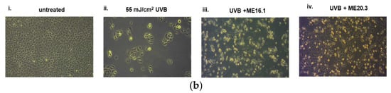 Figure 3. Protection of HaCaT cells by honey extracts against UVB-induced cytotoxicity. Cells were pre-incubated with 20 μg/mL of honey extracts for 2 h, and then were UVB-irradiated (55 mJ/cm2) followed by further incubation for 2 h. Following a 24 h recovery period, cell viability was examined by trypan blue exclusion assay and phase contrast microscopy. (a) Cell viability determined by the trypan blue exclusion assay. Data presented are the mean ± SD of three independent experiments performed in duplicates. ## p ≤ 0.01, #### p ≤ 0.001, significant differences compared to untreated cells, ** p ≤ 0.01, *** p ≤ 0.001, significant differences between UVB-irradiated and honey-treated/UVB-irradiated cells. (b) Phase contrast microscopy of non-irradiated (i), UVB-irradiated (ii) and UVB-irradiated cells treated with ME16.1 (iii) and ME20.3 (iv). Representative figures of ten random fields for each condition examined in triplicates.