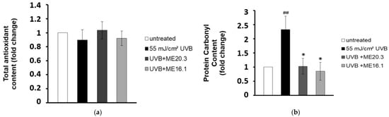 Figure 4. Honey extracts protect HaCaT cells from UVB-induced protein oxidation. HaCaT cells were pre-incubated with 20 μg/mL of honey extracts and then were either exposed to UVB irradiation (55 mJ/cm2) or left untreated. Cells were treated for 2 h with honey extracts and then allowed to recover for 24 h. (a) Total antioxidant content and activity in HaCaT cell lysates was assessed by the ABTS oxidation assay and expressed as fold change in Trolox equivalents compared to untreated cells. (b) Protein oxidation was estimated by measuring the protein carbonyl levels with the DNPH colorimetric assay. The concentration of the protein carbonyls was determined and adjusted to the total protein concentration (expressed as fold-change compared to the untreated cells). Data shown are the mean ±SD of three independent experiments performed in triplicates. ## p ≤ 0.01, significant differences compared to untreated cells, * p ≤ 0.05, significant differences between UVB-irradiated and honey-treated/UVB-irradiated cells.