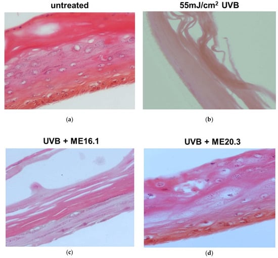 Figure 5. Assessment of the protective effect of honey extracts against UVB-induced skin damage. EpidermTM EPI-200 reconstituted skin tissues were treated in the apical surface with 20 μg/mL of honey extracts (diluted in assay culture medium) for 2 h, washed with PBS and then exposed to 55 mJ/cm2 of UVB irradiation. After UVB exposure, the tissues were incubated with honey extracts for 2 h and then washed with 1 × PBS. After 24 h, the tissues were harvested and sections were taken. Representative images of H&E staining of untreated (a), UVB-irradiated (b), and pre-treated with ME16.1 (c), or ME20.3 (d) skin tissues. Magnification ×400.