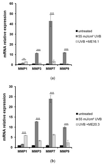 Figure 6. Honey extracts modulate the UVB-induced mRNA expression of MMPs in a 3D reconstituted human skin model (EpidermTM EPI-200). Tissues were pre-treated with 20 μg/mL of honey extracts ME16.1 (a) or ME20.3 (b) for 2 h, UVB irradiated (55 mJ/cm2) and then treated with honey extracts for 2 h. After 24 h, the tissues were harvested and total RNA was extracted. For the quantification of MMPs-1, -3, -7 and -9 mRNA levels quantitative real-time PCR was performed. The expression levels of all MMPs were normalized to those of β-actin. Untreated cells served as reference sample. For the relative quantification, the formula RQ = 2−ΔΔCt was used. Representative graphs of three independent experiments. Each reaction was performed in triplicate. ** p ≤ 0.01, *** p ≤ 0.001, significant differences compared to the UVB-irradiated cells.