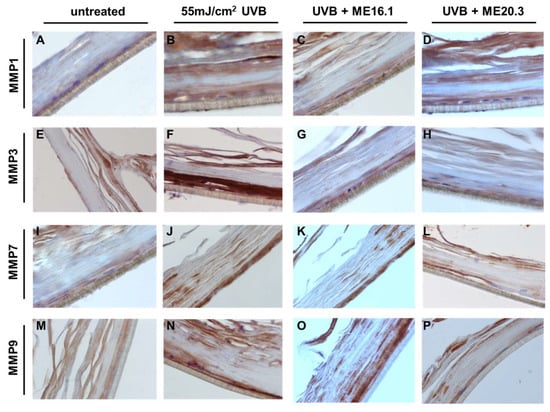 Figure 7. Honey extracts inhibit the UVB-induced expression of MMPs in a 3D reconstituted human skin model (EpidermTM EPI-200). Tissues were pre-treated with 20 μg/mL of honey extracts ME16.1 or ME20.3 for 2 h, followed by UVB irradiation (55 mJ/cm2) and then incubation with honey extracts for 2 h. After 24 h, the tissues were harvested, sections were taken and immunostaining was performed to detect UVB-induced MMP-1 (AD), MMP-3 (EH), MMP-7 (IL) and MMP-9 (MP) positive cells. Representative images at 400× magnification of untreated (A,E,I,M), UVB-irradiated (B,F,J,N), ME16.1 pre-treated/UVB-irradiated (C,G,K,O) and ME20.3 pre-treated/UVB-irradiated (D,H,L,P) tissues.