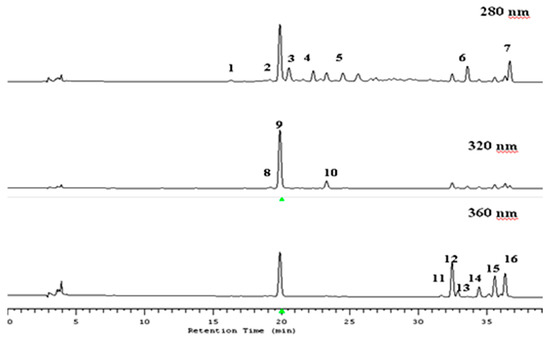 HPLC chromatograms of the apple extract at 280, 320 and 360 nm. 1—procyanidins B1; 2—(+)-catechin; 3—procyanidins B2; 4—(−)-epicatechin; 5—procyanidins C1; 6—phloretin 2′-xyloglucose; 7—phloretin 2′-glucose; 8—caffeic acid hexose conjugate; 9—chlorogenic acid; 10—p-coumaroyloquinic acid; 11—quercetin 3-O-rutinoside; 12—quercetin-3-O-galactoside; 13—quercetin-3-O-glucoside; 14—quercetin-3-O-arabinoside; 15—quercetin-3-O-xyloside; and 16—quercetin-3-O-rhamnoside.