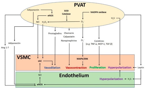 In addition to PVRF, recent studies have also demonstrated that PVAT can secrete PVAT-derived contracting factors (PVCFs), which modulate vasoconstriction [31,32,33]. Studies in rats have shown that both PVRFs and PVCFs can modulate local vascular tone through endothelium-dependent or endothelium-independent effects, by as-of-yet underdetermined mechanisms [25,34]. Currently, a number of potential PVCFs have been suggested, including chemerin [35], calpastatin [36], norepinephrine (NE) [37], AngII, and ROS [38]. Also, upon perivascular nerve stimulation, PVAT may produce superoxide (O2−) mediated by NADPH oxidases, which enhances the arterial contractile response. This enhancement of contractile effect involves the activation of tyrosine kinase and the mitogen-activated protein kinase/extracellular signal-regulated kinase (MAPK/ERK) pathway. Moreover, the contractile effects of PVAT are regulated by other antioxidant enzymes including SOD (superoxide dismutase) and catalase. Both Mn-SOD and CuZn-SOD are expressed in PVAT [25,38]. When stimulated by NE, the expression of Mn-SOD is increased and the expression of catalase is decreased in PVAT, which induces the generation of O2− in PVAT [30].