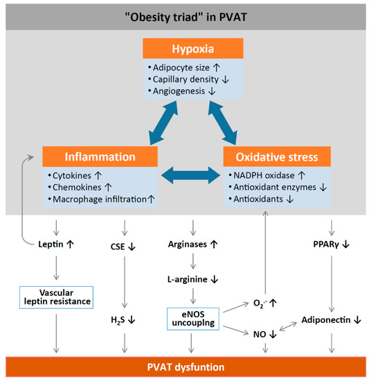 PVAT inflammation could be related to hypoxia. Hypoxia stimulates the production of inflammatory cytokines and chemokines from PVAT and infiltrating macrophages [4]. In obesity, adipocytes become hypertrophic, leading to inadequate perfusion and consequent local hypoxia. Hypoxia-inducible factor alpha (HIF-1α), a key mediator of hypoxia, is increased in the adipose tissue of obese subjects [66]. HIF-1 α is responsible for the stimulation of inflammatory mediator production, such as TNF-α and IL-6, and for suppressing the expression of adiponectin [67]. Incubation with TNF-α and IL-6 in PVAT leads to the attenuation of the anticontractile effects of PVAT, while the induction of hypoxia also causes inflammation and the loss of the anti-contractile function of PVAT [4]. This hypoxia-induced PVAT dysfunction can be normalized by in vitro incubation with either anti-TNF-α antibody, anti-IL-6 antibody, or by catalase and SOD antagonists. From these observations, PVAT loses its anticontractile properties after the increase of oxidative stress during obesity. In addition, obesity related PVAT dysfunction, increased inflammation, and oxidative stress are critical features in atherogenesis. Atherosclerotic lesions are characterized by the activation of NADPH oxidases, as well as increased eNOS uncoupling and O2− generation [68]. The combination of oxidative stress and inflammation creates a vicious cycle that is further supported by a variety of metabolic and genetic risk factors leading to atherogenesis [69]. Therefore, increased oxidative stress in PVAT is a critical link between obesity and vascular complications.