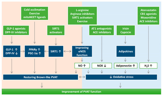 In addition, the activation of SIRT1 promotes mitochondrial biogenesis in adipose tissue via PGC-1α [142] and is involved in adipose tissue browning [143], suggesting that SIRT1 may also be involved in the regulation of PVAT browning. On the other hand, NO can regulate SIRT1 expression in adipose tissues [144], and it is conceivable that NO may also regulate SIRT1 in PVAT. Therefore, the interplay between PVAT SIRT1 and eNOS in controlling the browning and inflammation status of PVAT has been recently proposed [145]. SIRT1 may be a critical target in maintaining browning and normal adipokines secretion in PVAT.